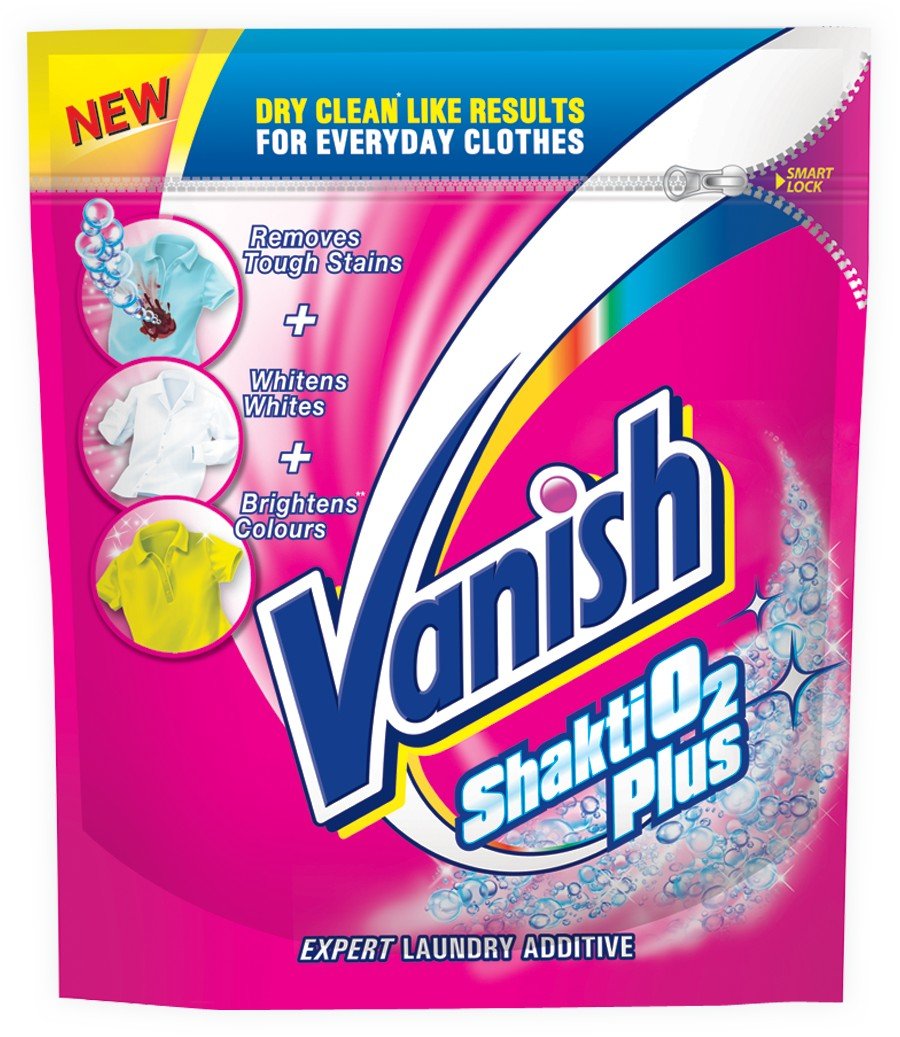 Vanish shakti O2 plus-the expert laundry additive. It contains active oxygen that removes tough stains gently by penetrating to the heart of the stains and active brighteners that whitens your whites and brightens the coloureds, so that you get dry clean like results for your regular clothes - in every wash.