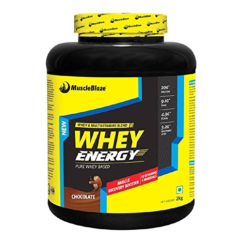 MuscleBlaze Whey Energy is a superior blend of quick acting whey proteins and multivitamins to fuel high energy needs in bodybuilders, fitness enthusiasts and strength training individuals. Each serving of MuscleBlaze Whey Energy delivers 20g of ultra-filtered whey concentrate and immediate-acting whey protein isolate to kick start recovery and trigger muscle protein anabolism after an intense workout and helps build lean muscle mass. Fortified with 13 vitamins and 5 minerals, MuscleBlaze Whey Energy acts as a Muscle Recovery booster and builds energy to push those last few reps. The presence of essential vitamins and minerals in MuscleBlaze Whey Energy improves immunity and supplies extra dash of energy for longer and fiercer training sessions. The added MCTs (Medium Chain Triglycerides) contribute to fat burning metabolism. Pure whey based premium protein blend of MuscleBlaze Whey Energy is an all-round muscle recovery formulation and offers a high quality protein formula to fulfill everyday protein needs of fitness beginners and muscle building enthusiasts. Each serving delivers 4.56g BCAAs and 9.48g Essential Amino Acids to quicken recovery and reduce muscle fatigue after a strenuous workout.