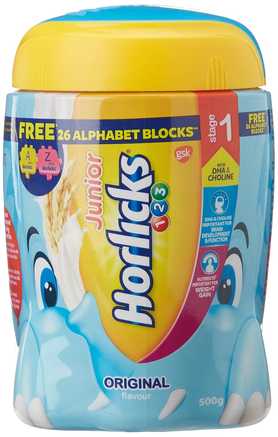 Junior Horlicks Stage 1 Health and Nutrition Drink - 500 g (Original) with Free 26 Alphabets Blocks