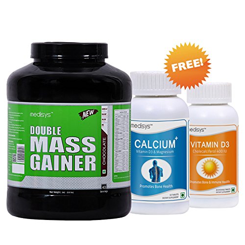 Medisys Double Mass Gainer - 3Kg [Free-Calcium + Magnesium & Vitamin D3 - 400 IU] Medisys Double Mass Gainer is a unique blend of balanced carbohydrates and proteins fortified with essential vitamins and minerals that relieves the muscle fatigue after exercise. Medisys double mass gainer contains fast digesting whey protein which is rich in amino acids that gets easily absorbed in your muscles and fuels for muscle recovery . On the other hand, casein protein which is absorbed slowly helps in his formation of new muscle tissues. Whey and casein protein together helps to achieve lean and toned muscle build. Medisys double mass gainer not only contains 22 vital vitamins and minerals that relieves muscle fatigue after exercise but also contains fibres that helps to improve better absorption of all nutrients and better digestion to give your body a support it needs to pack on lean muscle. Suggested use: Add 2 heaping scoops (75g) t0 180ml of skimmed milk or cold water. blend for 45-60 seconds for a thick and creamy shake. take 1-4 such shakes per day to build mass. BREAKFAST-POST WORKOUT-IN BETWEEN MEALS-BEFORE BED