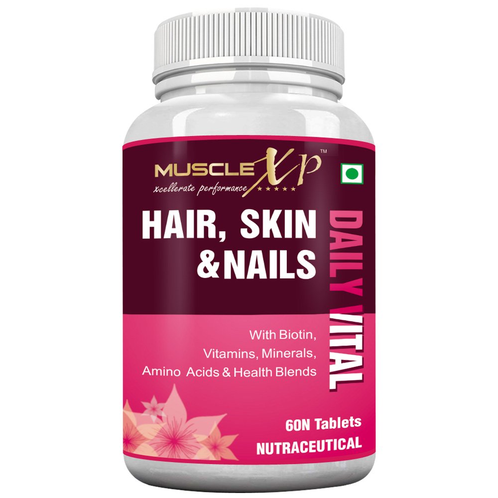 MuscleXP Hair Skin and Nails MultiVitamin with Biotin is a Complete Daily Multivitamin. It contains vitamins, minerals, amino acids, and nutrients important to maintain healthy hair, skin and nails and for general health. One serving offers vitamins, minerals, amino acids, biotin, antioxidants, and other essential nutrients.